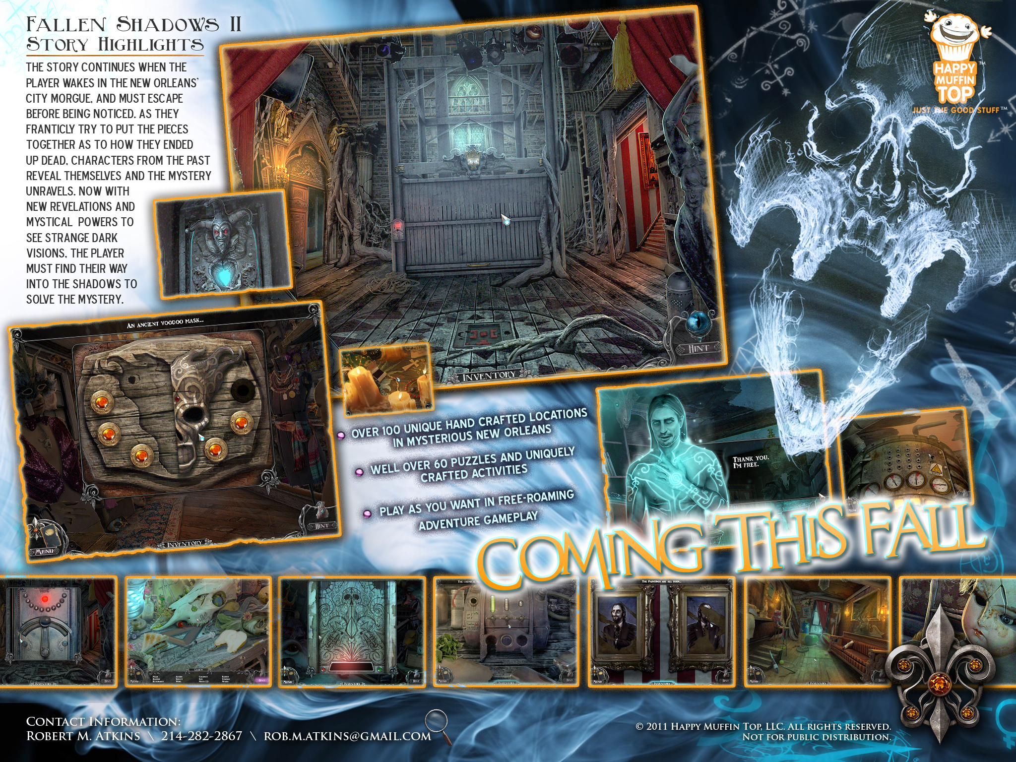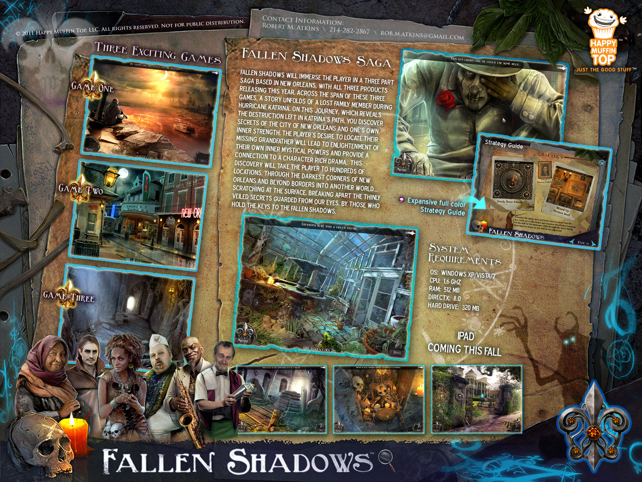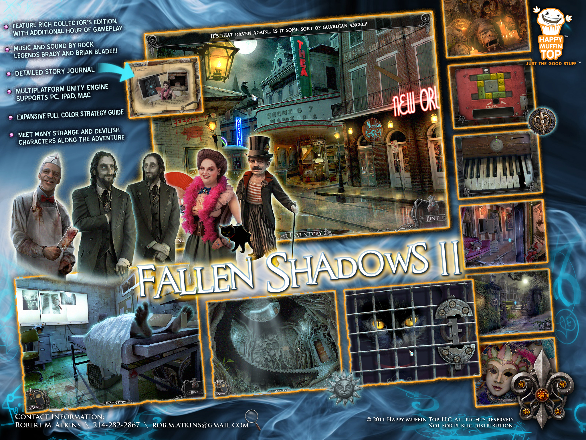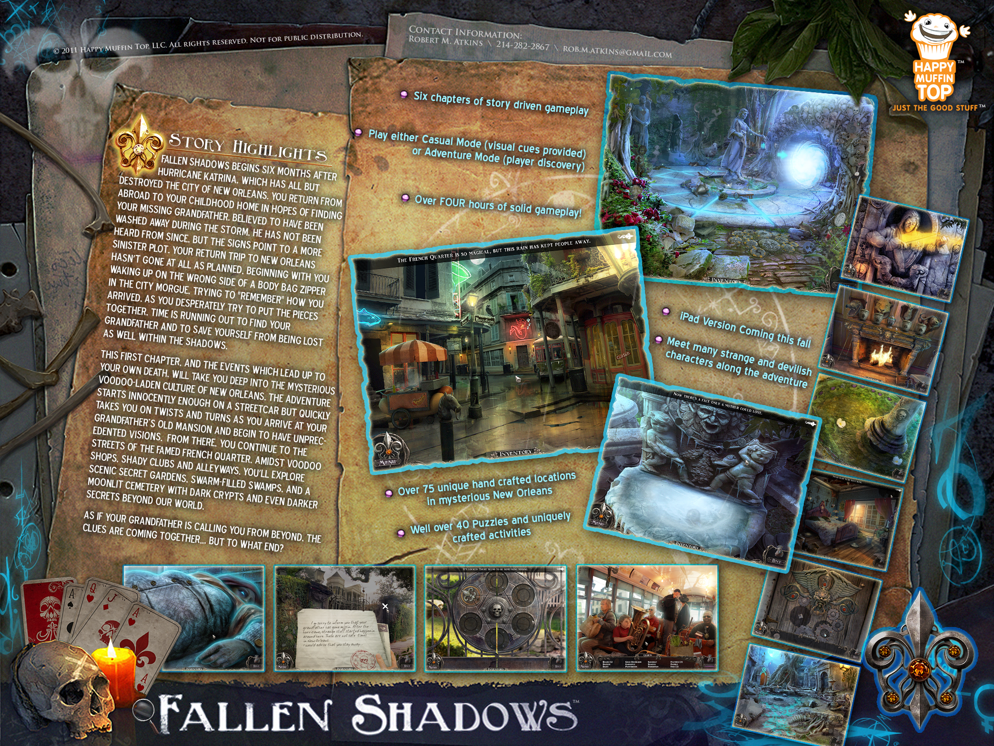 After leaving MumboJumbo, I co-founded Happy Muffin Top with Richard Luong and Adrian Carmack. Our boutique art house created the Fallen Shadows mystery adventure franchise, inspired by the mysticism of New Orleans.